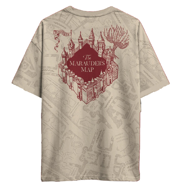 La maglietta è realizzata in morbido cotone traspirante. La grafica , presente su tutta la t-shirt, rappresenta la Mappa del Malandrino. Completano il tutto dei dettagli bordeaux, in rilievo.
