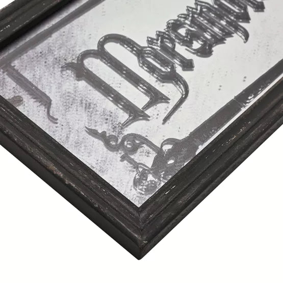 La targa a specchio è realizzata in MDF resistente con finitura lucida. Ha una forma rettangolare con cornice. Presenta due pratici ganci che vi permetteranno di poterla attaccare alla vostra parete.