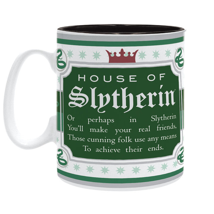 La tazza, realizzata in ceramica sul fronte riporta lo stemma della Casa e sul retro le qualità principali di un perfetto Serpeverde.