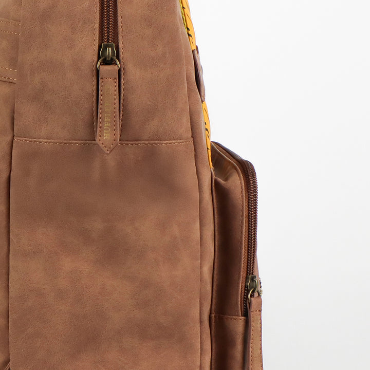 Lo zaino realizzato in ecopelle è caratterizzato da uno scomparto principale con schienale imbottito e ha una tasca sul fronte.